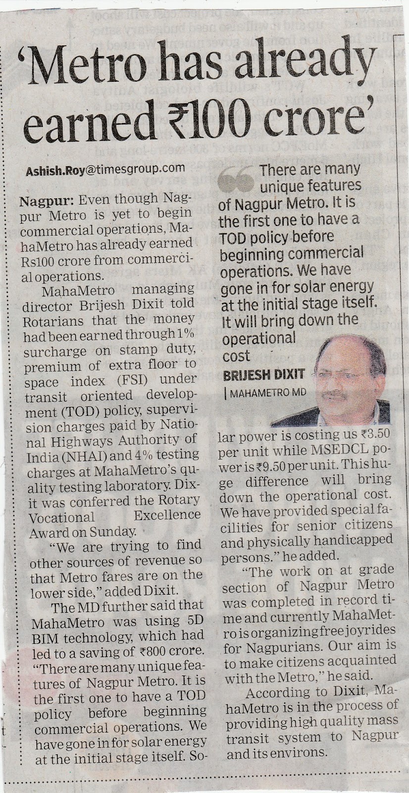 As I served railways as Nagpur as my Head Quarter for 23 years.When we have ground level railway lines available from Itwari station in Nagpur city and through Nagpur Railway station,Ajni,Khapri ,Butibori are all connected and enough space /infrastructure already available the what is the purpose to have Metro at investment cost of around 10000 crore rupees.As per this news very ROSY picture presented but our experience in AIR INDIA shows our failture when government try to do business.Later on in future It may be handed over to Private Party.We just watch and wait for another 2 years.